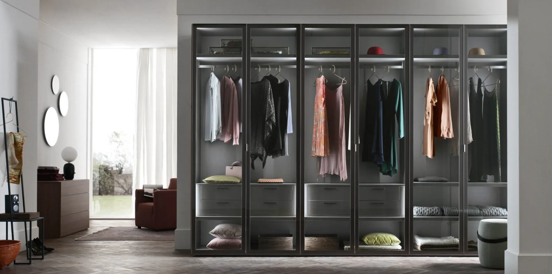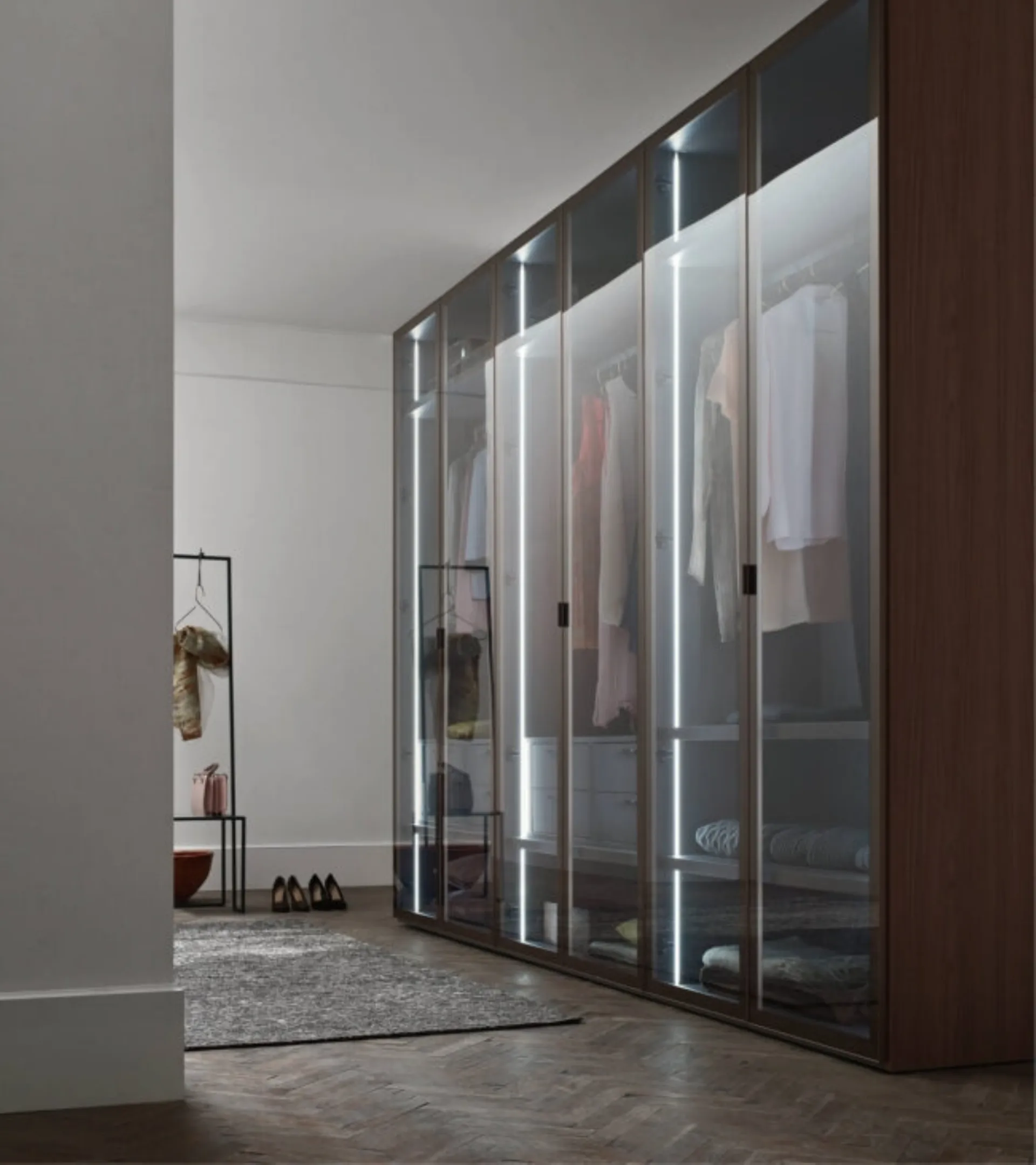 Se vuoi armadiature a muro con ante battenti, clicca e scopri l'armadio Glax di Maronese in vetro.
