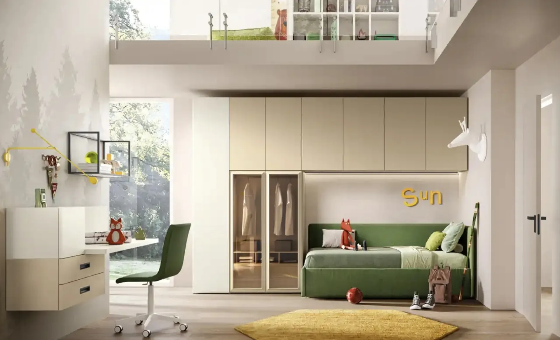 Con questa cameretta K111 Moretti Compact Camerette, tra le soluzioni a ponte, potrai allestire stanze moderne per bambini.