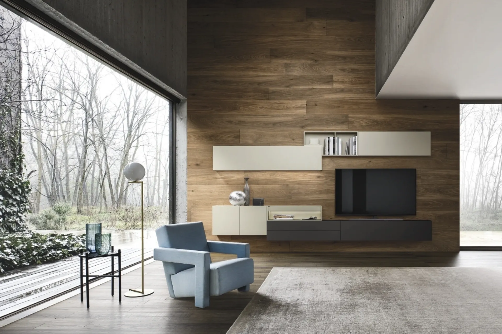 Vuoi ammobiliare un living dinamico e operativo? Ti offriamo la parete attrezzata Lampo 019 Sangiacomo dalle forme decise moderne.