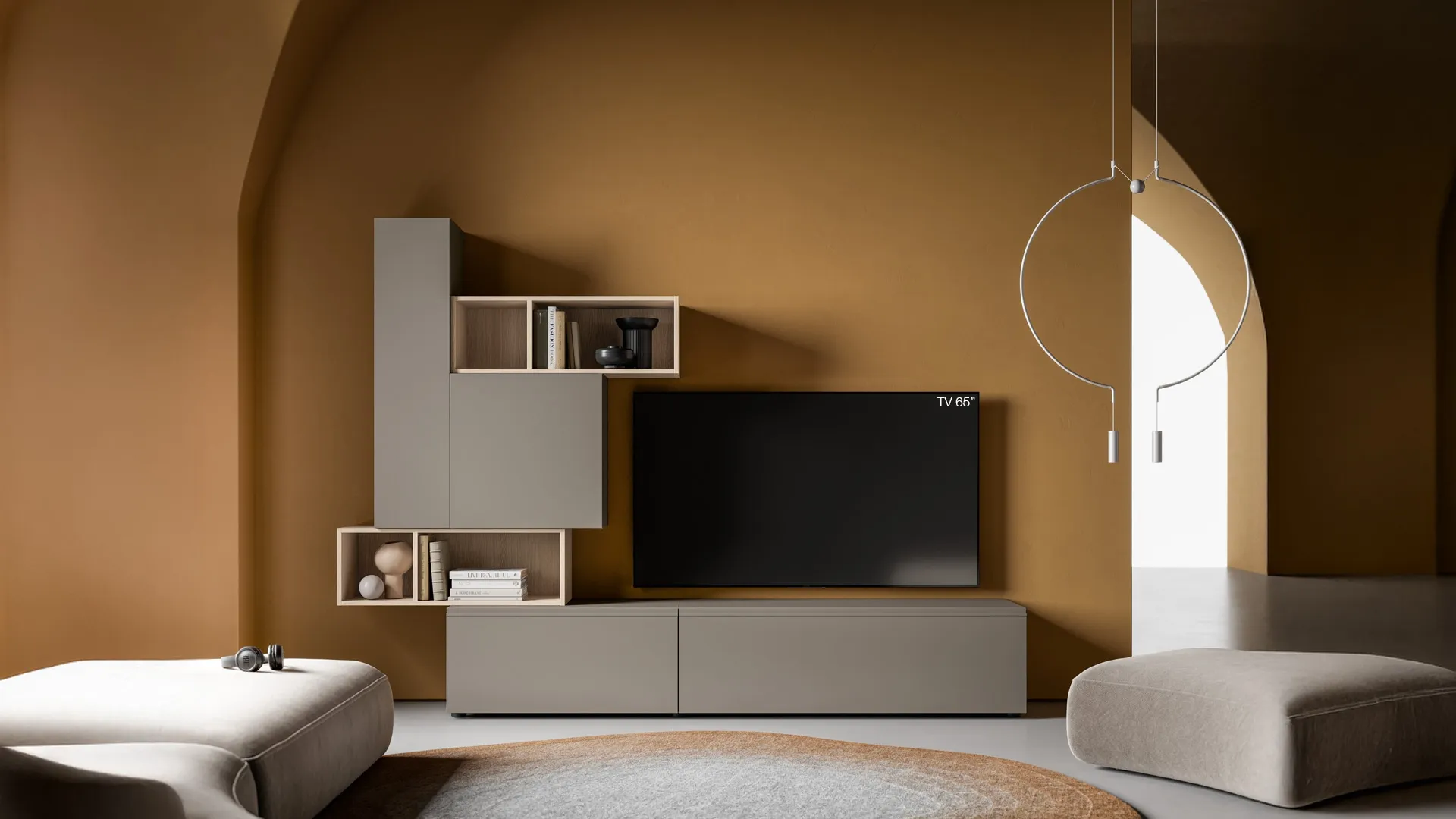 Vuoi allestire un soggiorno dinamico e operativo? Ecco a te la parete attrezzata Pratico PTG452 SantaLucia dalle linee decise moderne.