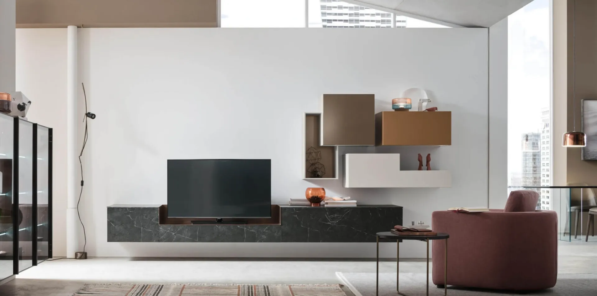 Se vuoi ultimare un living dinamico e operativo dalle linee moderne, ti offriamo la parete attrezzata Seta Comp SU2201 Maronese.