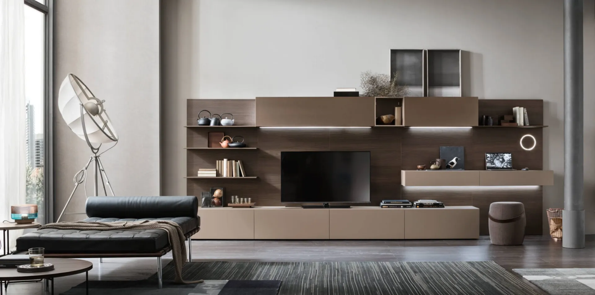 Vuoi allestire un soggiorno dinamico e operativo? Ti presentiamo la parete attrezzata Unix Comp SU2115 Maronese dalle forme decise moderne.